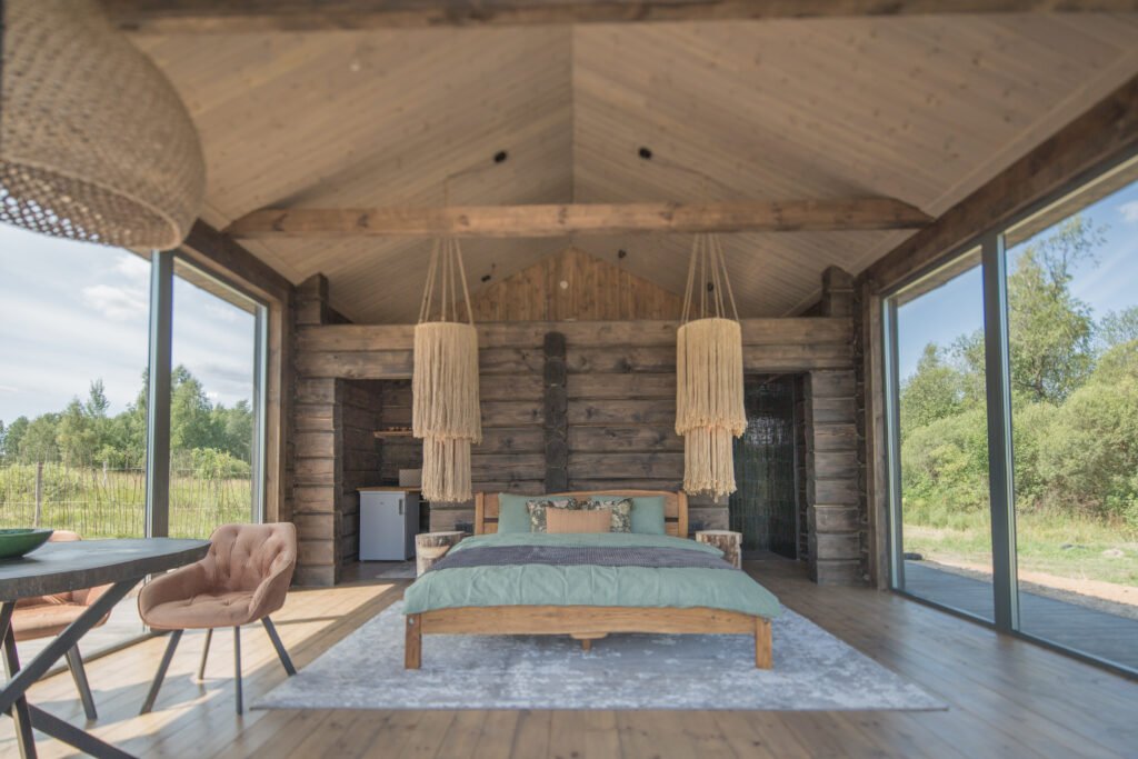 The Raistas granary house is located in the Dykro meadow, on the edge of the impenetrable swamp. When you stay there, you will relax in private. The large part of the walls of the house consists of panoramic windows with a view of the pond and wild meadow. The cottage has everything you need for a comfortable rest – a kitchenette and a bathroom. When you go outside, you will find a fire pit and a spa area – a jacuzzi tub. The warmth of the cabin is provided by a wood-burning stove and an air conditioner, which will not only warm you in the winter, but also refresh you in the summer. The panoramic windows of the Raisto granary are oriented to the east, so this house is ideal for welcoming the sunrise while lying in bed with a cup of coffee.